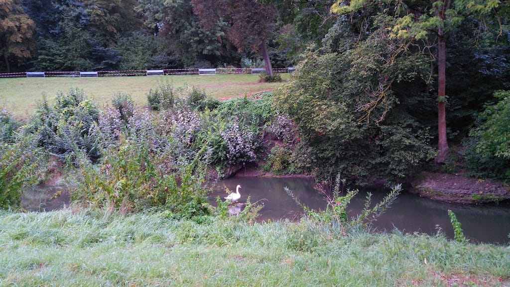 Die Kinder untersuchten auf ihrer Exkursion die Fließgeschwindigkeiten an verschiedenen Stellen des Flusses im Ilmpark. Ein Schwan begleitete die Kinder fortan auf dem Fluss.