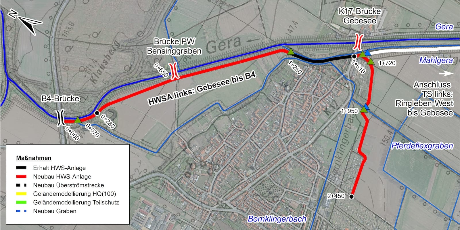 Innerhalb von Gebesee wird der mittels einer Spundwand ertüchtigte Abschnitt in die zukünftige Hochwasserschutzlinie integriert. Entlang des südlichen Bebauungsrandes wird ein Deich von der K17 bis zum ansteigenden Talhang neugebaut.